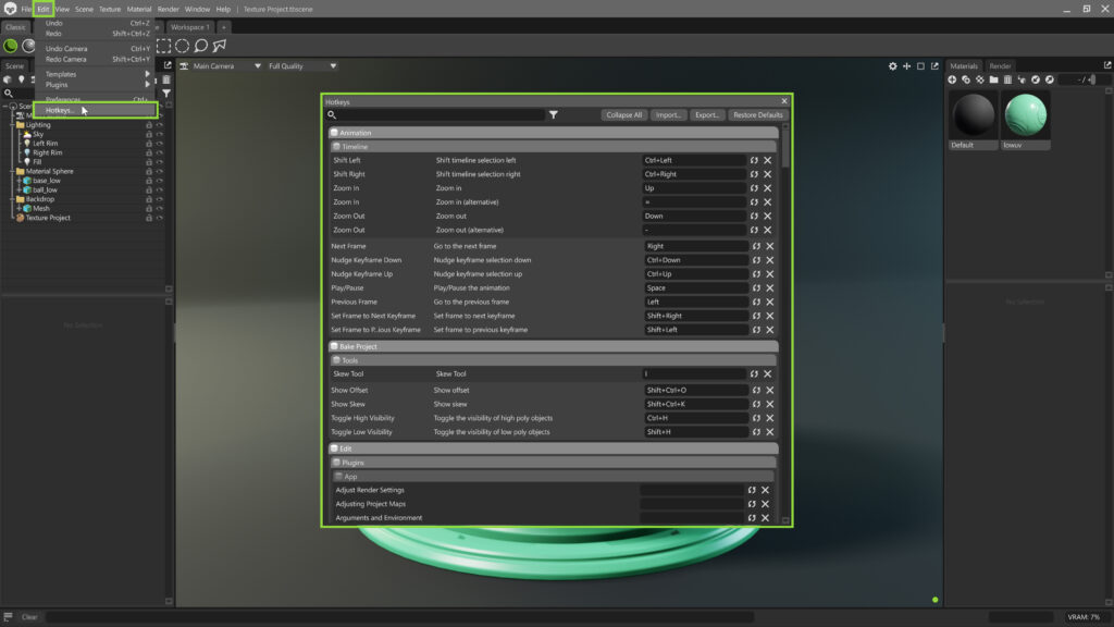 Toolbag 5.02 introduced a customizable hotkey editor that lets you assign shortcuts to commonly used tools and actions. To open the Hotkey Editor, select the menu option Edit > Hotkeys.