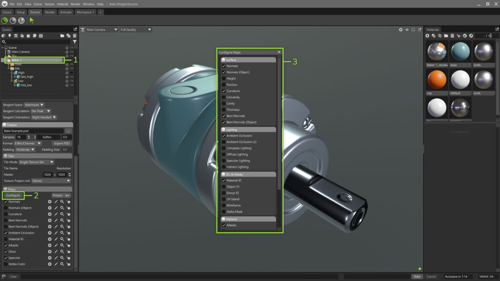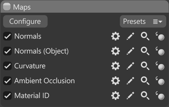 You can choose which maps to bake by pressing the Configure button and adding any maps you need from the available list. Added maps can be enabled or disabled at any time. You can also apply one of the built-in map presets or save your own custom preset for future use.